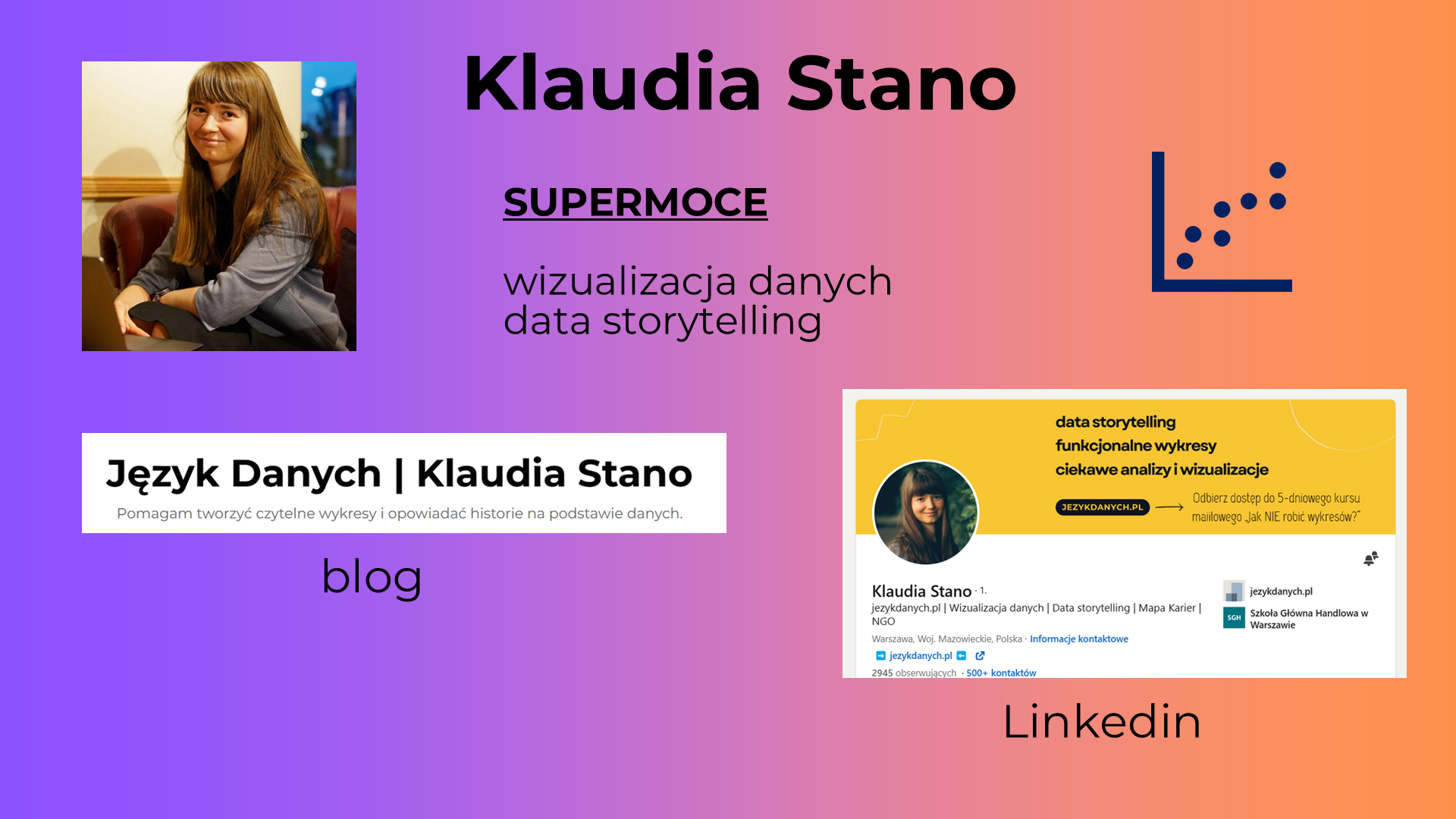Klaudia Stano jest autorką bloga “Język Danych” aktywną na Linkedinie. Skupia się na tworzeniu czytelnych wykresów oraz efektywnej prezentacji danych. Jej misją jest popularyzacja wizualizacji danych w Polsce, co realizuje poprzez różnorodne projekty, takie jak #52wykresy2022, czy ostatnia akcja #BI_NGO.