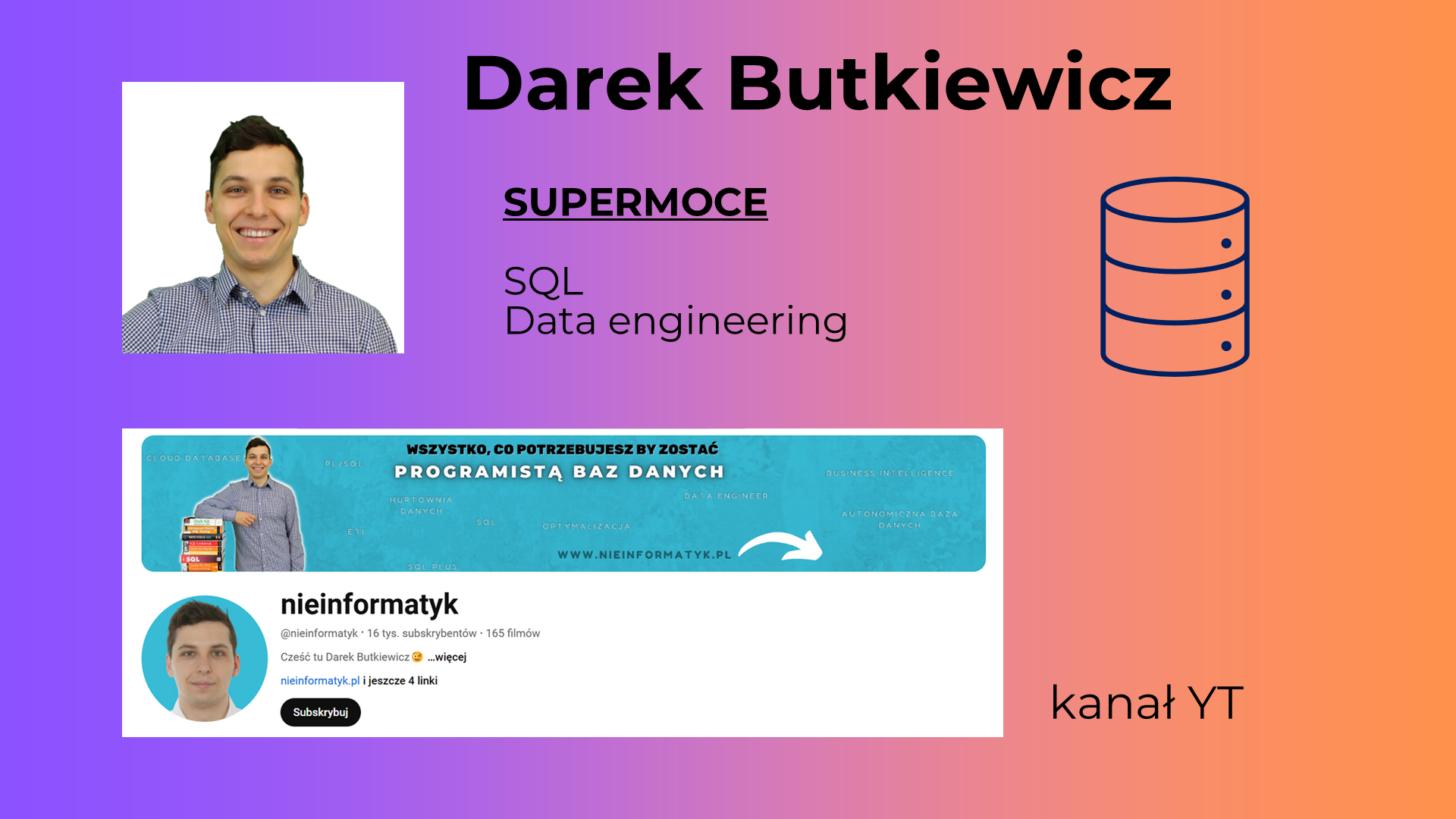Jego nagrania koncentrują się głównie na SQL – i jego wykorzystaniu w różnych bazach danych od Oracla przez MS SQL Server aż po PostgreSQL. Darek ma ponad 7-letnie doświadczenie w pracy z danymi, co pozwala mu na przekazywanie praktycznej wiedzy oraz najlepszych praktyk. Na swoim kanale Darek prezentuje różnorodne zagadnienia, od podstawowych zapytań SQL po bardziej zaawansowane techniki analizy danych. Jego styl nauczania jest przystępny i angażujący, co sprawia, że jego filmy są popularne wśród osób zaczynających swoją przygodę z programowaniem.