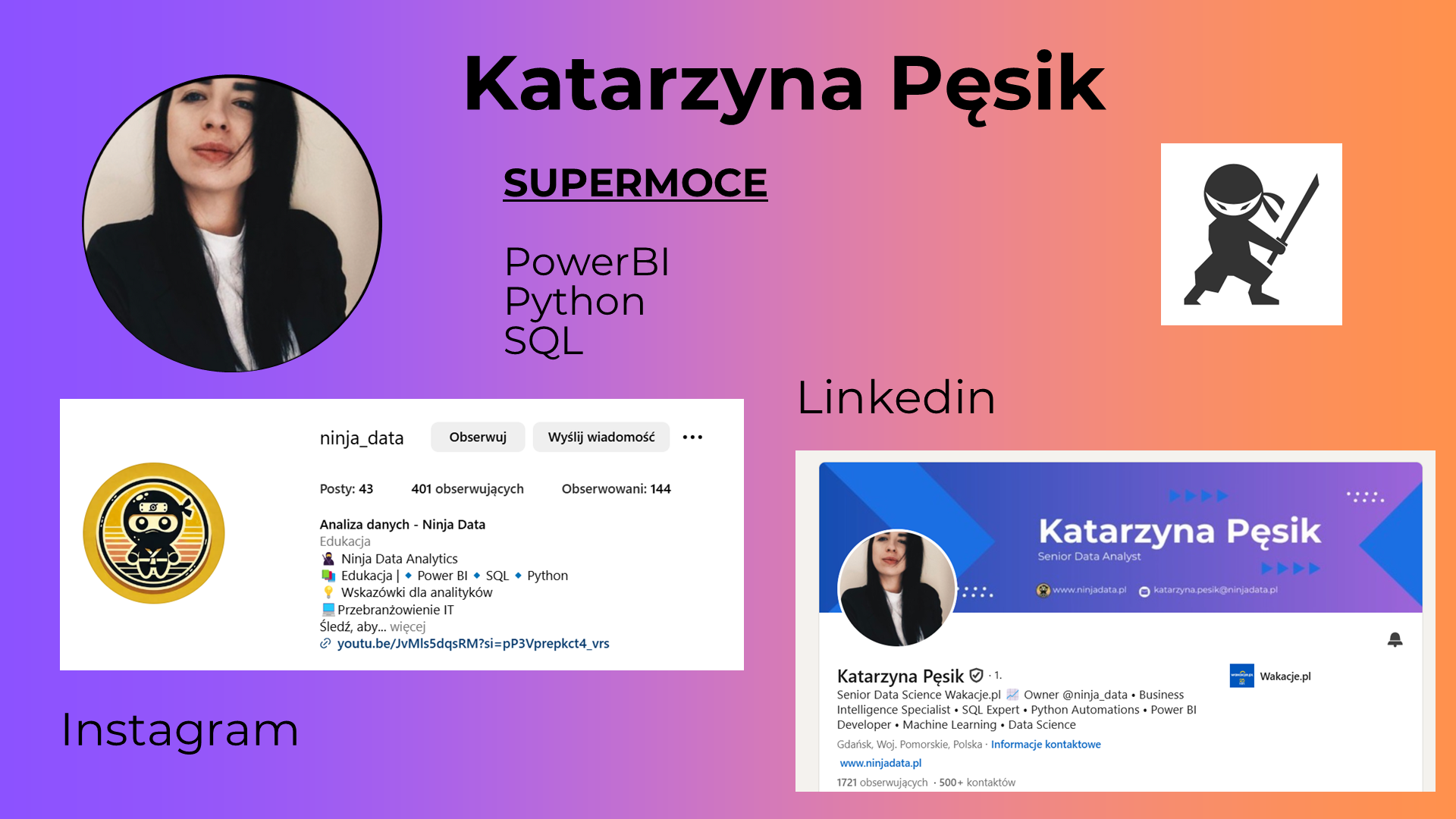 Katarzyna Pęsik jest doświadczoną analityczką danych znaną głównie z instgramowego profilu “ninja_data” oraz ze swojej aktywności na Linkedin.