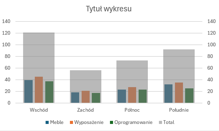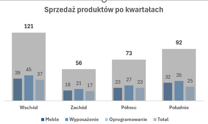 Na początku zrobimy zwykły wykres słupkowy, gdzie w ramach każdego regionu, będziemy mieć po 3 słupki – sprzedaż mebli, wyposażenia i oprogramowania.
