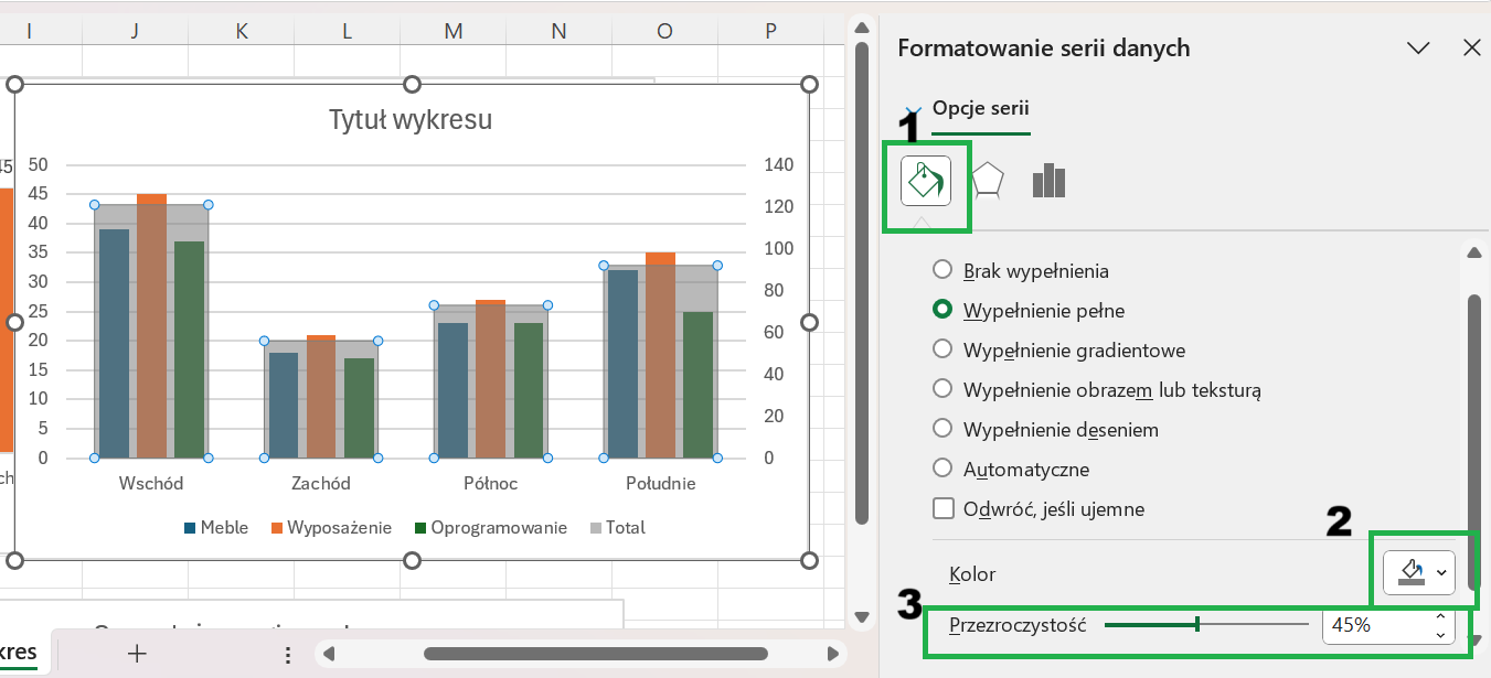 Przechodzimy do opcji “Wypełnienie i linia“, a następnie zmieniamy kolor wypełnienia słupka na ciemnoszary (oczywiście można inny, jeśli bardziej pasuje do Twojej palety) i przezroczystość na 40-50%.